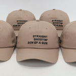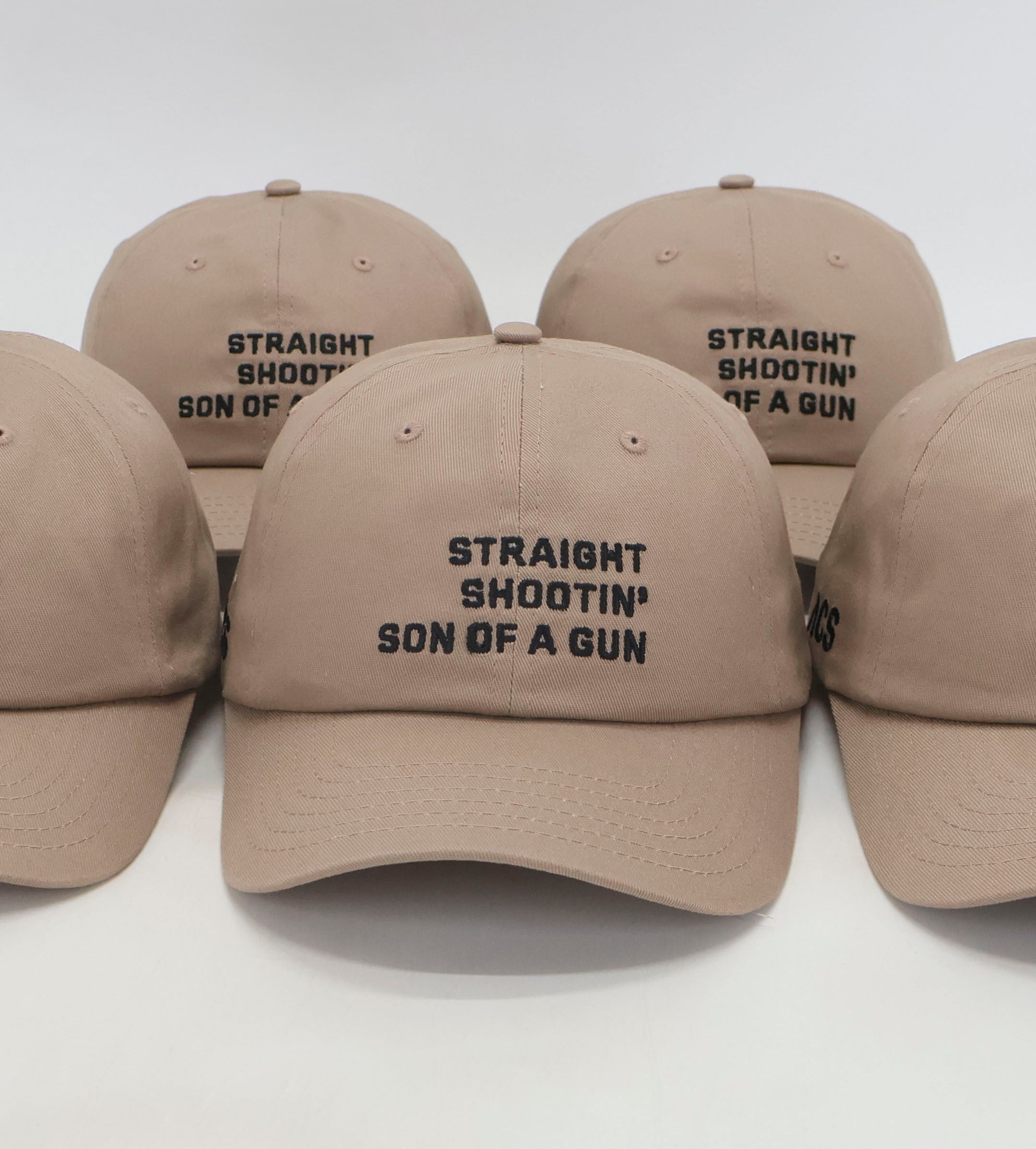 This classic dad hat features a curved brim, adjustable strap, and “Straight Shootin’” embroidery on the front.