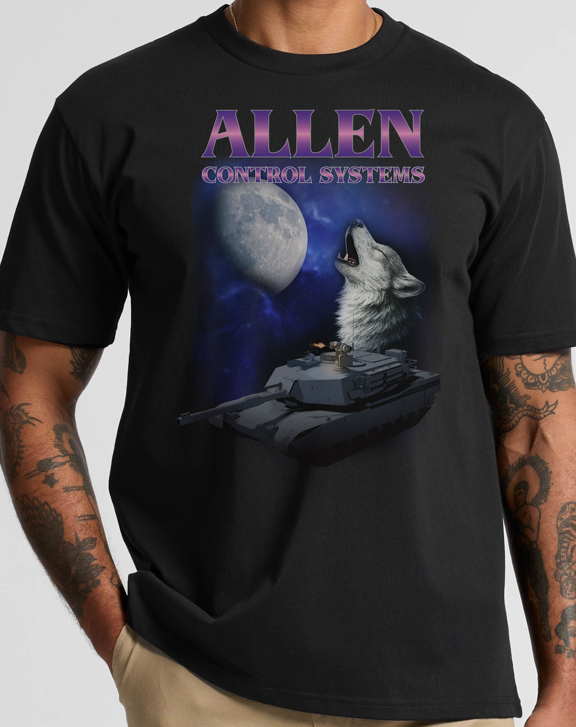 This enzyme-washed black tee delivers a structured fit with a soft, broken-in feel. Printed with Allen Control Systems across the chest and our wolf-howling-at-the-moon-over-a-Bullfrog-integrated-tank artwork, this shirt is a nod to strength, precision, and unapologetic ACS energy (and a light throwback to earlier times).